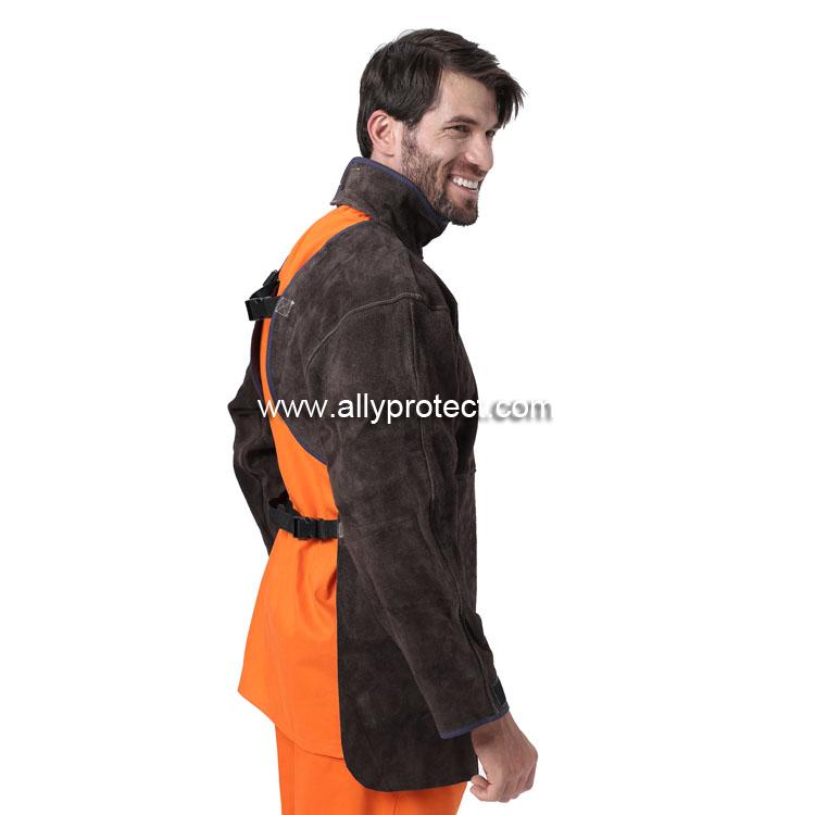 - 產品描述: [ AP ]炭啡色牛二層芯皮全皮護胸立領長袖圍裙,適于在炎熱氣溫或室內焊接使用,背部透氣,不會感覺太炎熱。